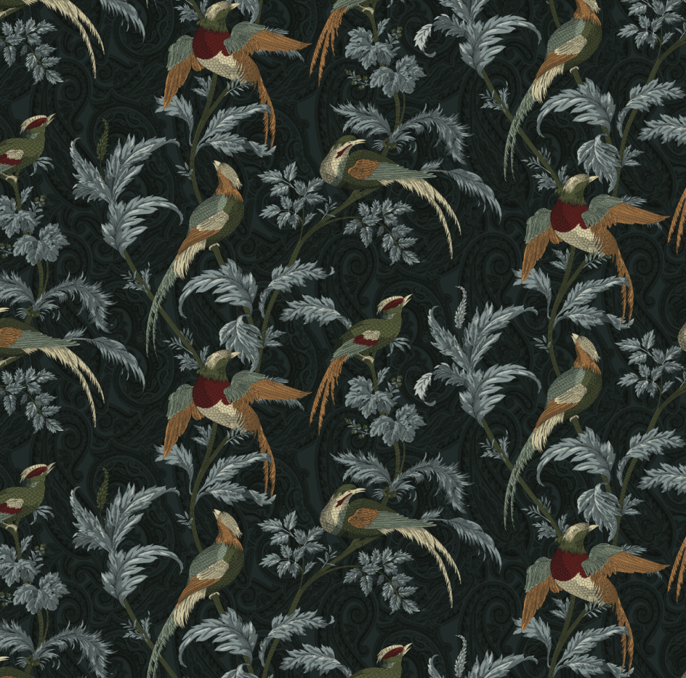 Изысканный дизайн в винтажном стиле с изображением экзотических птиц и ветвей на фактурном фоне с орнаментом пейсли. Элегантный дизайн в приглушенных тонах для штор , обивочных тканей и домашнего декора.